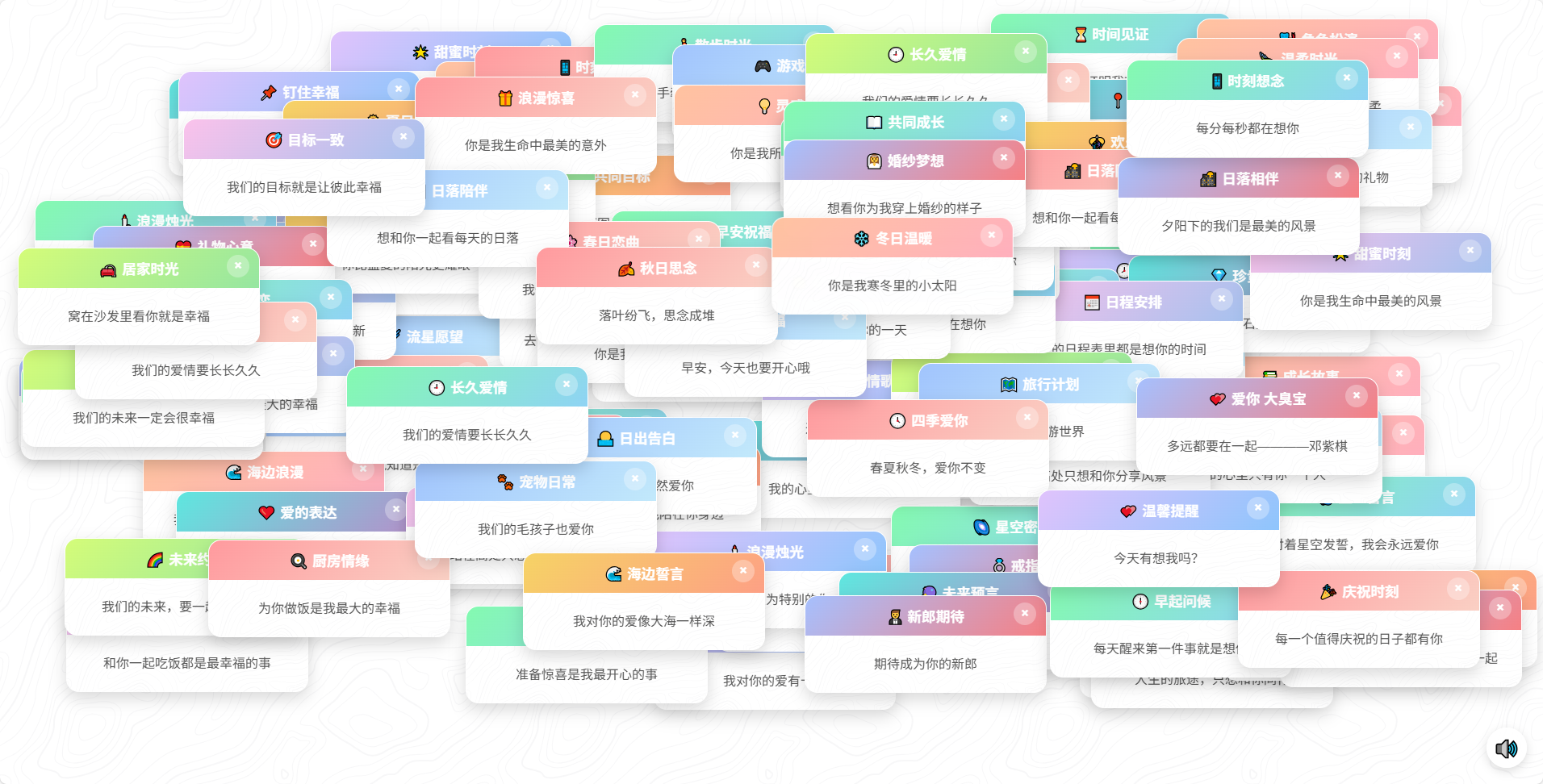 最近网上很火的情侣网页弹窗 我也是跟风搞了一个好吧,网页版 我把链接放在底部啦 这是电脑端的页面1-1 进入页面后第一眼看到的就是这个页面了,点击“确定”就进入到1-2 这是电脑端的页面1-2 然后你就会听见一首背景音乐自动播放(如果没有播放有可能是浏览器阻止播放了) 进入到这里你将看到网页上会随机弹出一个窗口并带上一些内容 (一共128条内容) 既然是网页,那就少不了有手机端 这是手机端的页面1-1 这是手机端的页面1-2 手机端访问没有电脑访问的效果那么好,但是也能拥有一样的效果 点击前往情侣页面弹窗 点击前往情侣页面弹窗 2025-11-03 20:19:52 星期一